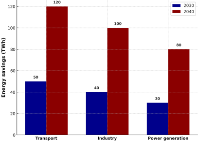 According to projections by the International Energy Agency (IEA) and the U.S. Department of Energy (DOE), large-scale adoption of hydrogen could reduce primary energy demand and significantly cut emissions by 2030–2040. Figure 2 illustrates estimated scenarios of energy savings resulting from hydrogen integration in different sectors of the U.S. economy.