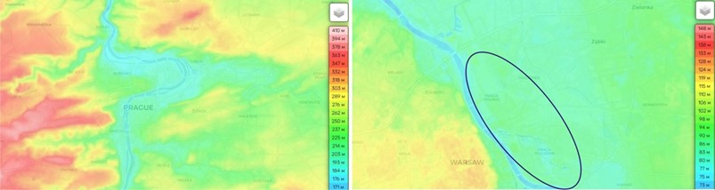 ПРАГА (Чехия). Этимологию объясняют чешскими словами prah «порог» (хотя порогов нет) либо pražiti «выжигать» (якобы место, где выжигали лес) [2, с. 340; 3, с. 339], славянским prah «брод». Однако, есть еще и пригород Варшавы, именуемый Прага. При этом, оба поселения расположены примерно на одинаковой местности. А объединяющей эти топонимы характеристикой может выступать балтское слово rãgas «рог, нарост, наплыв» (значения, определяющие положение обоих поселений на правобережье и Влтавы, и Вислы), а также «мыс, стрелка; заостренный, выступающий участок земли» (значение, характерное для Пражского града), с префиксом pa- «около, рядом» [6, с. 374; 15, с. 495; 10]. Таким образом, Прага (с метатезой плавных) – поселение в низине среди бугров (наплыва) у реки или просто «побугорье» (рис. слева – Прага, справа – район Прага (в овале) в Варшаве).