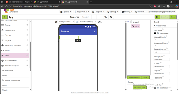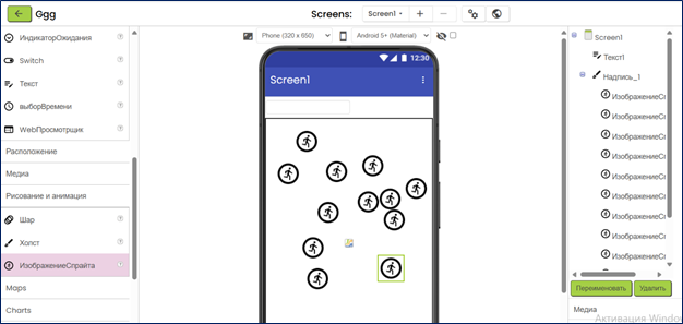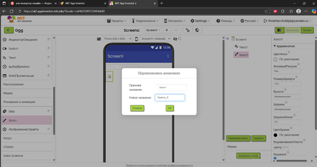В панели компонентов слева, в разделе «User Interface», выбирается элемент «Label» (Текст) и перетаскивается на экран эмулятора телефона; этот текстовый блок в дальнейшем будет использоваться для отображения названия текущего предмета для поиска. Затем в разделе «Drawing and Animation» необходимо добавить компонент «Canvas» (Холст), который служит основным игровым полем для размещения фона и интерактивных объектов; этот холст рекомендуется сразу переименовать для удобства, например, в «Холст_Игры».