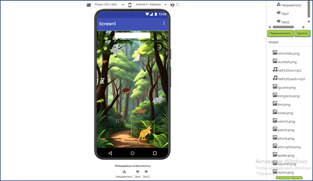 Все графические файлы загружаются в раздел «Media» через кнопку «Upload File», после чего фоновое изображение назначается свойству «BackgroundImage» холста, а изображения животных поочередно назначаются компонентам «ImageSprite», которые также перетаскиваются на холст из панели компонентов. Для усиления игрового опыта добавляются звуковые эффекты: в разделе «Media» размещаются два компонента «Sound», которым присваиваются заранее скачанные файлы — один для правильного ответа, другой для неправильного.