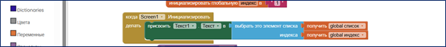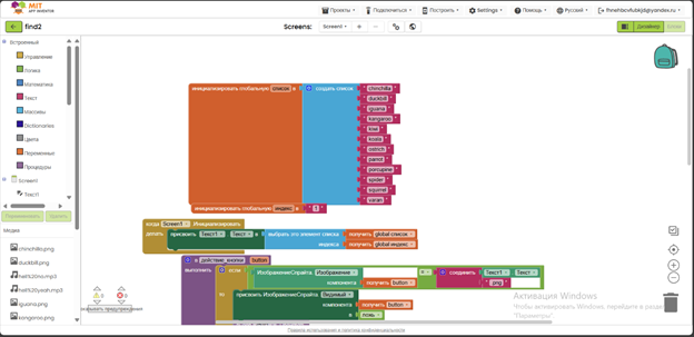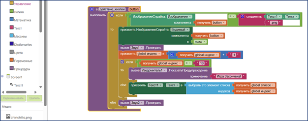 После завершения проектирования интерфейса необходимо перейти в режим «Blocks» для создания логики игры. В первую очередь формируется глобальный список (List), содержащий названия всех предметов для поиска, а также создается переменная «индекс», которая будет отслеживать текущий предмет, который игрок должен найти. При запуске экрана (событие «Screen.Initialize») программа устанавливает начальное значение индекса и отображает в текстовом метке название первого предмета из списка. Далее, для каждого из спрайтов прописывается событие «When Sprite.Touched»: при касании проверяется, совпадает ли его картинка с текущим элементом списка; если да, воспроизводится звук успеха и индекс увеличивается, переходя к следующему предмету, в противном случае играется звук ошибки.