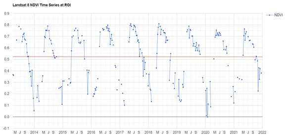 Основными материалами послужили данные космических снимков Google Earth Engine в расчете индекса вегетации NDVI, главным образом для моделирования урожайности за период с 2012-2022 (рис 2) [4].