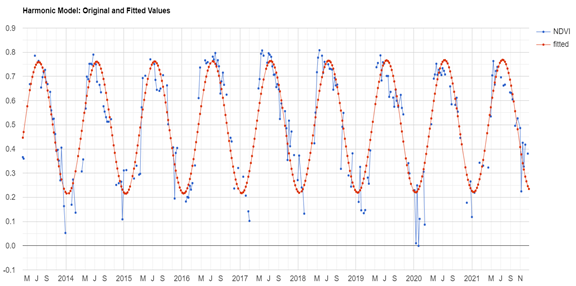 График демонстрирует моделирование сложных временных рядов с использованием гармонической модели. Временной ряд разбит на сумму синусоид с различными частотами. Представленная модель может быть расширена путем добавления дополнительных полос, представляющих более высокие частоты, для более точного описания данных. На графике видно, что модель состоит из двух синусоид с разными частотами и амплитудами, что позволяет учесть два цикла в году. Однако модель имеет значительную погрешность и довольно неточно отражает данные. Например, она не учитывает экстремальные падения значений NDVI и несколько пиков в каждом году, которые не соответствуют модели.