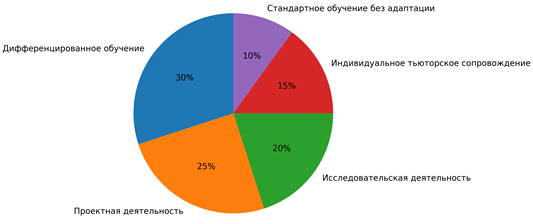 Наиболее распространёнными подходами являются дифференцированное обучение и проектно-ориентированные методы, обеспечивающие адаптацию содержания и темпа обучения к индивидуальным возможностям учащихся. Исследовательская деятельность способствует формированию навыков критического мышления и самостоятельного познания, тогда как индивидуальное тьюторское сопровождение позволяет выстраивать персонализированные образовательные траектории [5]. Вместе с тем в ряде образовательных организаций сохраняется доминирование стандартного учебного процесса без целенаправленной адаптации под потребности одарённых школьников, что ограничивает возможности полноценной реализации их потенциала. Соотношение основных педагогических практик, применяемых в работе с одарёнными школьниками, представлено на рисунке 1 в виде круговой диаграммы.