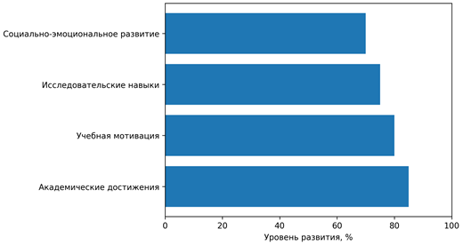 Данные, представленные на рисунке 2, демонстрируют, что образовательная среда с выраженной институциональной поддержкой и использованием адаптивных педагогических практик оказывает наибольшее влияние на академические достижения и уровень учебной мотивации одарённых школьников. Существенные значения показателей развития исследовательских навыков указывают на эффективность деятельностных и проектно-ориентированных форм обучения, интегрированных в образовательный процесс. В то же время относительно более низкие показатели социально-эмоционального развития свидетельствуют о необходимости целенаправленного включения психолого-педагогических механизмов поддержки, направленных на формирование устойчивости, коммуникативных навыков и эмоционального благополучия одарённых учащихся. В совокупности полученные результаты подтверждают комплексный характер влияния образовательной среды и обосновывают необходимость системного сочетания институциональных условий и педагогических практик для полноценного раскрытия потенциала одарённых школьников.