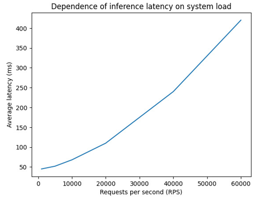 Ключевым параметром функционирования является задержка инференса при росте нагрузки. На рисунке 1 представлена зависимость средней задержки от интенсивности входящих запросов.
