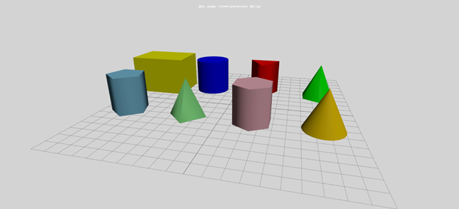 Для организации фигур мы использовали Декартову систему координат и расположили объекты в два ряда. Каждая фигура имеет свои координаты position.set(x, y, z):