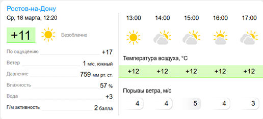В данной работе выполняется парсинг погоды для Ростова-на-Дону с сайта Gismeteo (рисунок 1) с использованием библиотеки Jsoup для извлечения температуры из HTML-структуры страницы. Для обеспечения корректной работы сетевых запросов применяется ExecutorService, организующий фоновый поток, а обновление пользовательского интерфейса выполняется через Handler. Подобные скрипты востребованы при создании мобильных информеров, особенно для регионов, данные по которым недоступны через официальные API. Стабильность библиотеки Jsoup и встроенных средств многопоточности Android обеспечивает надежность работы приложения в условиях ограниченных ресурсов мобильного устройства.